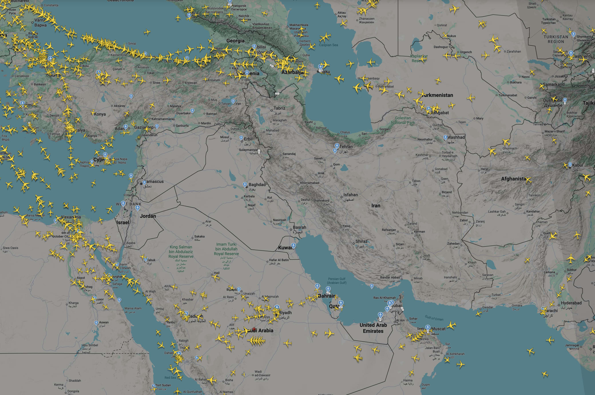 FlightRadar24 Air traffic across the middle East on Feb. 28th, 2026.