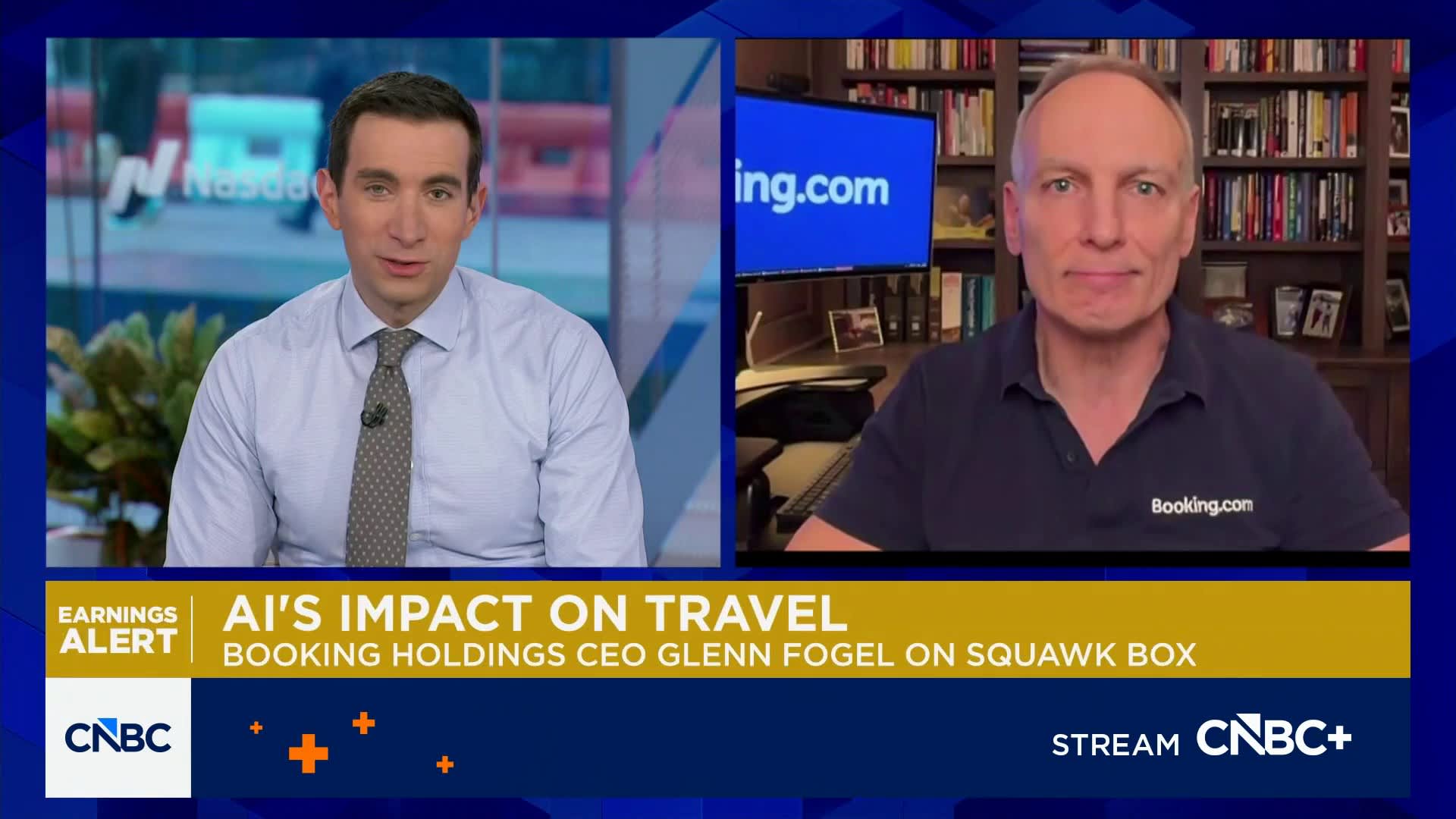 Booking Holdings CEO Glenn Fogel joins ‘Squawk Box’ to discuss the company’s quarterly earnings results, state of the consumer, impact of AI on travel, and more.