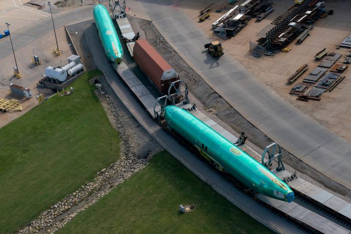 Boeing 737 fuselages on railcars at Spirit AeroSystems’ factory in Wichita, Kansas, on July 1, 2024.